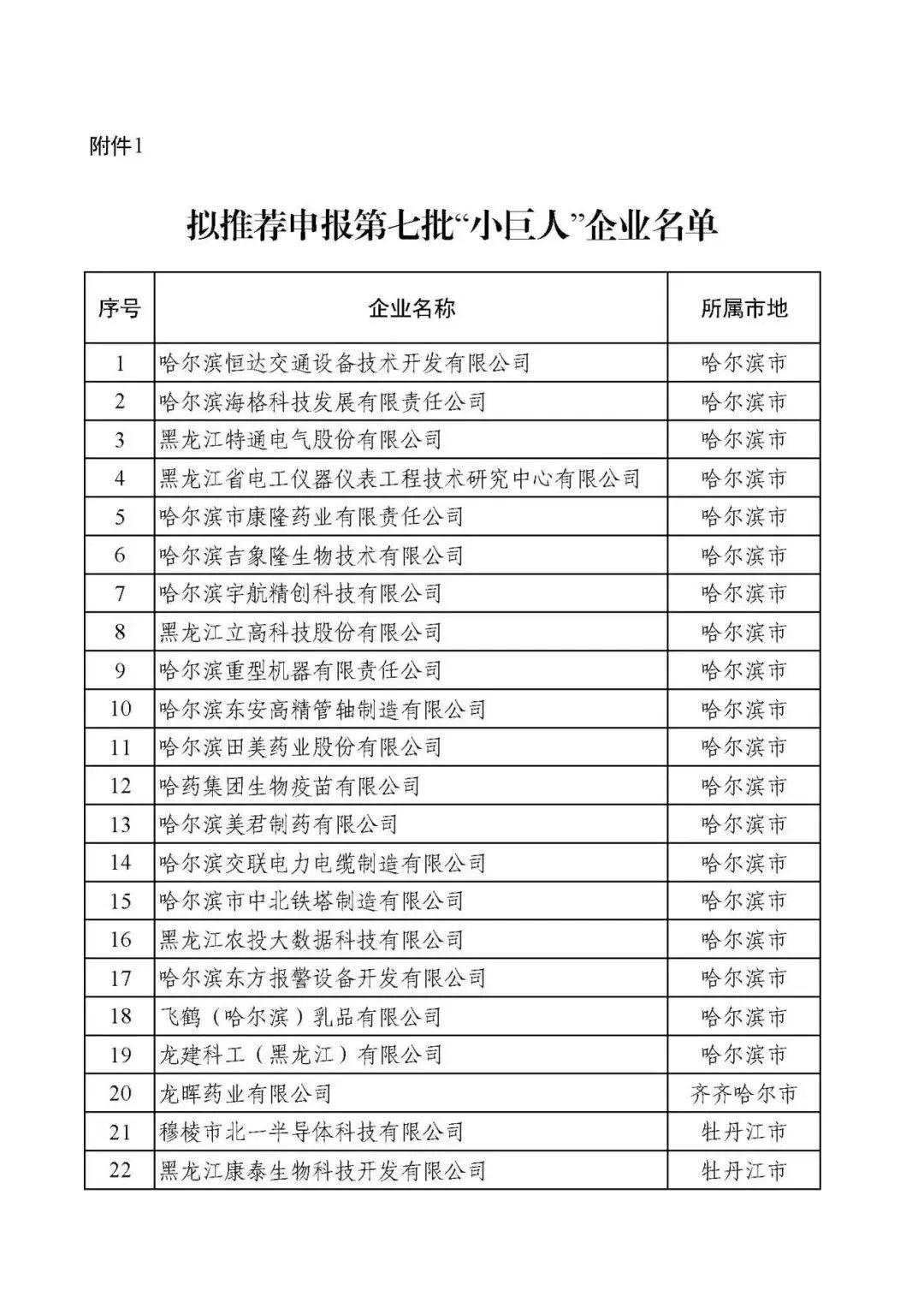 按照《工业和信息化部办公厅关于开展2025年专精特新“小巨人”企业认定和复核工作的通知》(工信厅企业函〔2025〕190号)和《黑龙江省工业和信息化厅关于组织开展第七批“小巨人”企业申请和2022年认定和复核通过“小巨人”企业复核申请推荐工作的通知》(黑工信企业函〔2025〕330号)要求,依据《优质中小企业梯度培育管理暂行办法》(工信部企业〔2022〕63号)有关规定,省工信厅组织开展了第七批“小巨人”企业申请和2022年认定和复核通过“小巨人”企业复核申请推荐工作。经企业自愿申报、市(地)推荐、第三方机构审核、信用信息核查等程序,拟推荐哈尔滨恒达交通设备技术开发有限公司等39户企业申报第七批“小巨人”企业,拟推荐哈尔滨海邻科信息技术有限公司等16户企业申报“小巨人”企业复核,现予以公示,公示期为2025年6月11日—6月17日(5个工作日)。如有质疑或意见,请在公示期内据实反映。