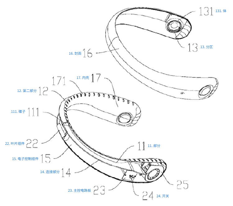 结构:挂脖风扇的内壳(贴脖子侧)开进风口,风扇从这些口吸风,吹进内外壳之间的风道。