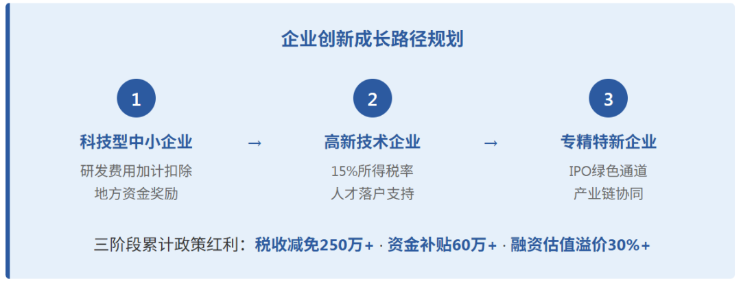 三阶段累计政策红利:税收减免250万+ · 资金补贴60万+ · 融资估值溢价30%+
