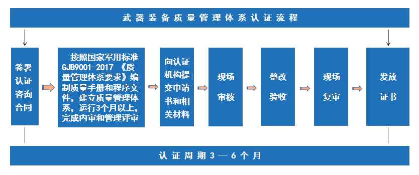 国军标质量管理体系认证(GJB9001C-2017)为中华人民共和国国家军用标准,也叫武器装备质量管理体系认证,依据《武器装备质量管理条例》相关规定,武器装备以及用于武器装备的计算机软件、专用元器件、配套产品、原材料都应进行质量管理,武器装备论证、研制、生产、试验和维修单位应当建立健全质量管理体系,对其承担的武器装备论证、研制、生产、试验和维修任务实行有效的质量管理,确保武器装备质量符合要求。